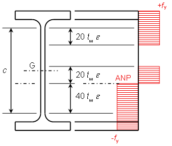La figure ci-dessous représente le diagramme des contraintes normales qui correspond à l’atteinte du moment de résistance plastique en tenant compte de ces largeurs efficaces. L’équilibre de la section en flexion simple conduit à considérer, pour une section doublement symétrique, une hauteur d’âme en traction égale à celle en compression, soit 40 twε .