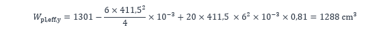 Étant donné que la semelle comprimée est de classe 2 et que l’âme est de classe 3, le paragraphe 6.2.2.4 de la norme NF EN 1993-1-1 permet d’utiliser la résistance plastique de la section en considérant des largeurs efficaces pour la zone comprimée de l’âme comme présenté plus haut. Le module plastique efficace de la section est alors :