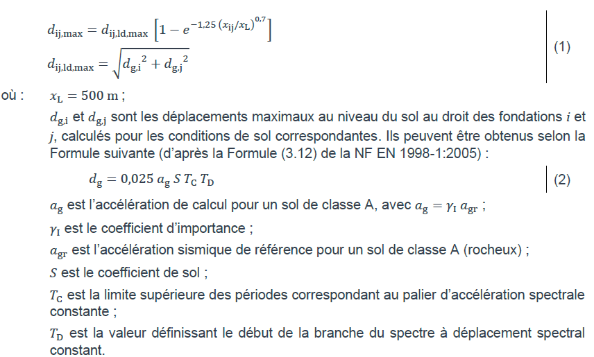 Dans le cadre de l’Eurocode 8, il est aussi possible de prendre en compte les déplacements différentiels en intégrant leur effet dans le calcul de la structure. Les valeurs de déplacements différentiels ne sont pas précisées dans les normes NF EN 1998-1:2005 et NF EN 1998-5:2005, mais peuvent être trouvées dans une note publiée en septembre 2025 par la commission de normalisation pour les règles de construction parasismiques (CN/PS).