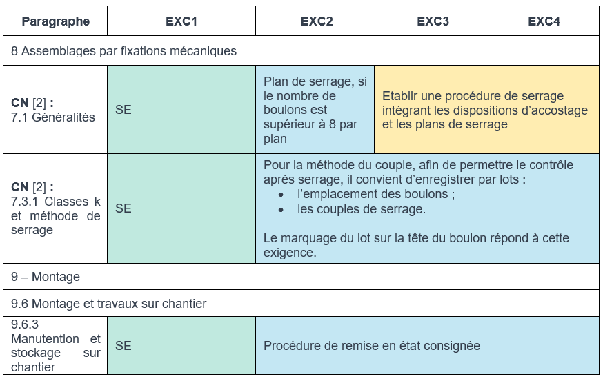 Dans les domaines du coupage, de la mise en œuvre des fixations mécaniques et du montage, ces tableaux montrent que très peu d’exigences varient en fonction de la classe d’exécution. On peut toutefois relever que le CN [2] apporte des précisions supplémentaires concernant la préparation du plan de serrage, point pour lequel une différenciation existe effectivement.