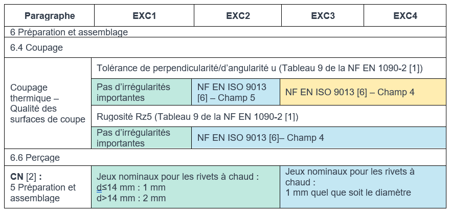 Les tableaux suivants synthétisent les différences entre les classes d’exécution définies dans la norme NF EN 1090‑2 [1] concernant les activités de préparation (coupage, perçage), de mise en œuvre de fixations mécaniques et de montage. Ils intègrent également les informations complémentaires issues du Complément National à la NF EN 1090‑2 (noté CN ci-après) [2] ainsi que du NF DTU 32.1 (noté DTU 32.1 ci-après [3], [4] et [5]), lorsque celles‑ci sont en lien direct avec les classes d’exécution.
