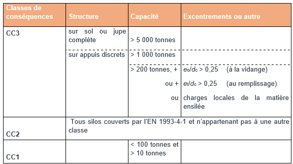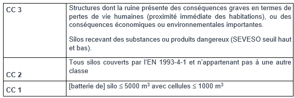 Les silos sont classés en classes de conséquences, destinées à représenter les conséquences d’une défaillance structurelle.